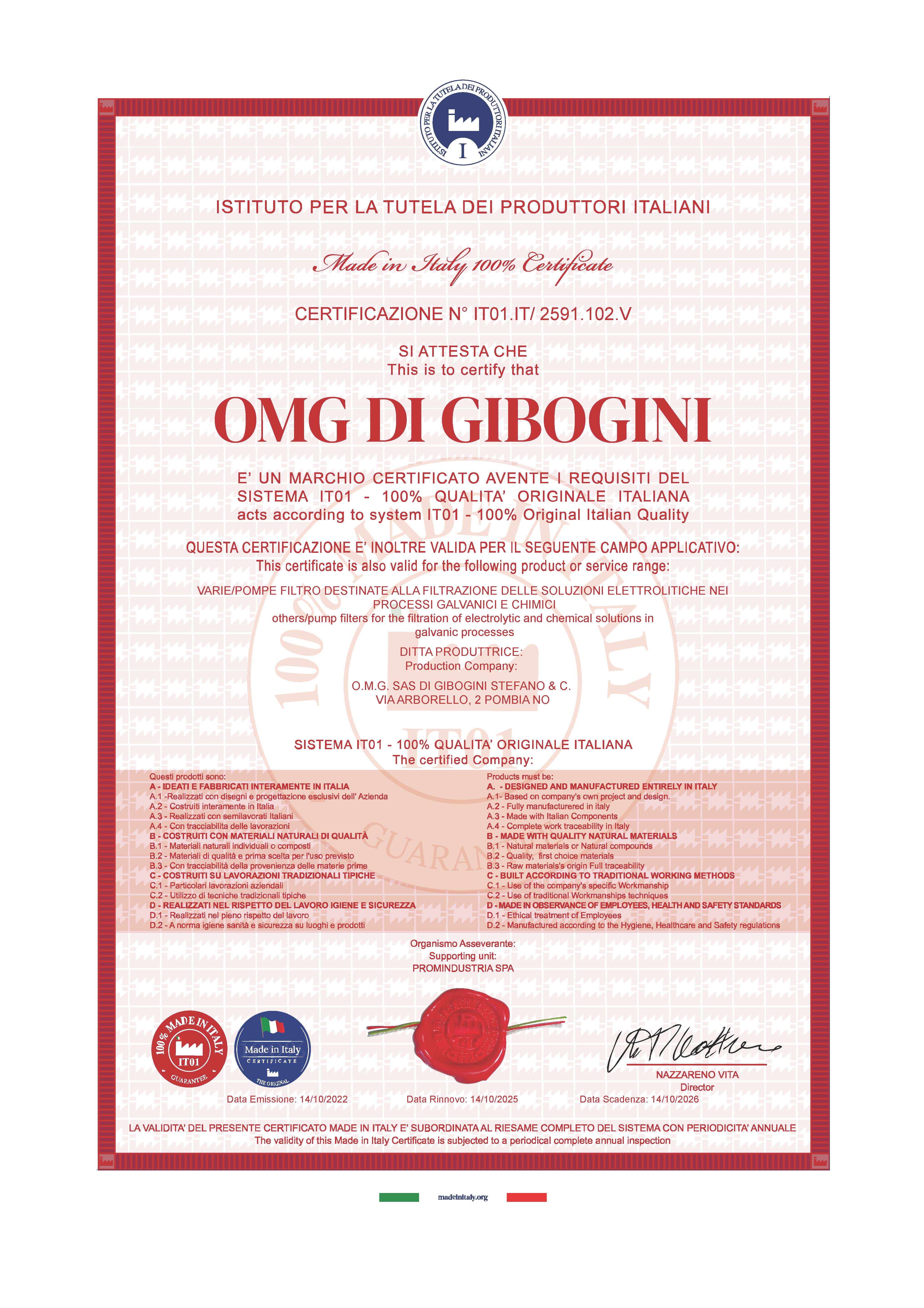 OMG DI GIBOGINI è un Marchio Certificato avente i requisiti del Sistema IT01-100% Qualità Originale Italiana